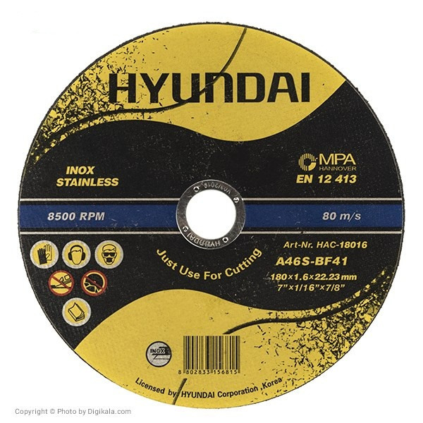 اگر از دستگاه فرز آهنبر استفاده میکنید به صفحهای مناسب و با کیفیت نیاز خواهید داشت. صفحهی فوق توسط شرکت معتبر «هیوندای» (Hyundai) تولید میشود. این صفحه ساختاری فیبری دارد و برای برش استیل طراحی شده است. قطر این صفحه 180 میلیمتر و قطر شفت آن 22.23 میلیمتر است. ضخامت این صفحه برای برش مناسب بوده و اندازهای برابر 1.6 میلیمتر دارد. این ضخامت موجب افزایش سرعت برش میشود و نباید از آن به عنوان صفحهی ساب استفاده شود. توجه به مشخصات دستگاه فرز در هنگام نصب و استفاده از این صفحه ضروری است. سرعت گردش دستگاه فرز در حین کار با این صفحه نباید از 8500 دور در دقیقه تجاوز کند و حداکثر سرعت خطی قابل تحمل آن 80 متر بر ثانیه است. این صفحه تنها برای برش استیل مناسب است و نباید برای برش سنگ مورد استفاده قرار گیرد. شرکت «هیوندای» تجربهای بالا در زمینهی تولید ابزارآلات برقی و دستی دارد و محصولاتی با کیفیت را روانهی بازار میکند.
