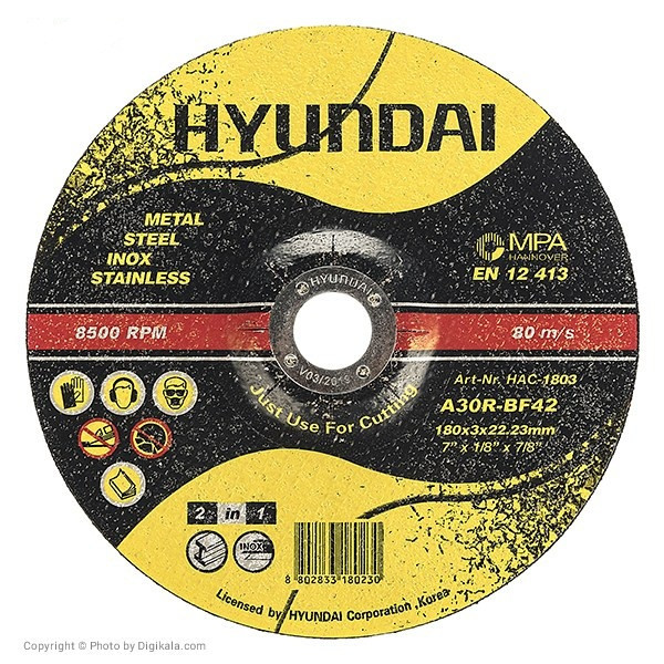 محصول فوق توسط شرکت «هیوندای» (Hyundai) تولید میشود و برای فرزهای آهنگری مورد استفاده قرار میگیرد. این صفحه از قطری برابر 180 میلیمتر برخوردار است. قطر شفت این صفحه 22.23 میلیمتر بوده و از ضخامتی 3 میلیمتری سود میبرد. ساختار این صفحه فیبری بوده و به تکنولوژی برش سریع مجهز است. از آنجایی که این صفحه مناسب نصب روی دستگاه فرز آهنگری است، میتواند سرعتهای بالا را تحمل کند. در حین کار با این دستگاه باید این نکته را مد نظر قرار داد که سرعت چرخش دستگاه به بیش از 8500 دور بر دقیقه نرسد. حداکثر سرعت خطی این صفحه نیز نباید از میزان 80 متر بر ثانیه تجاوز کند. ضخامت کم این صفحه آن را به ابزاری مناسب برای برش تبدیل کرده است و از تنها میتوان برای برش آهن و استیل استفاده کرد. این صفحه با نام (HAC-1803) شناخته میشود. شرکت «هیوندای» تجربهی بالایی در تولید ابزارآلات برقی و دستی داشته و محصولات این شرکت از کیفیت قابل قبولی برخوردارند.